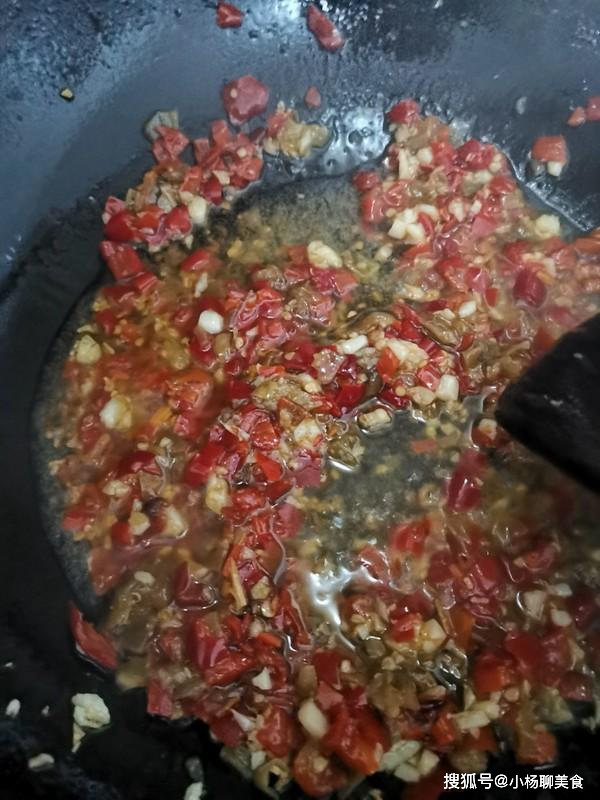 第三步:鍋內倒入適量油,油溫熱後放入葱薑末,花椒,炒出香味後放入紅剁椒,野山椒,炒出香味後,均勻的鋪在魚頭上面,淋上適量蒸魚豆豉。