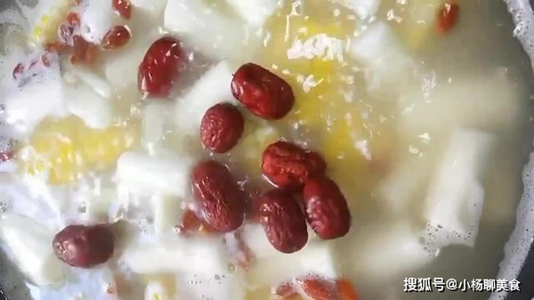 第三步:鍋中燒水,大火燒開後放入排骨,玉米、薑片和葱白段,蓋上鍋蓋。轉中火燉30分鐘左右,然後開蓋,放入山藥、枸杞、大棗,再轉大火燉10分鐘左右基本上排骨,玉米和山藥都熟了,可以用筷子插一下,看熟透了沒有。熟了之後撒上點鹽調味,在燉上一分鐘撒上蔥花就可也盛出裝碗開吃啦。