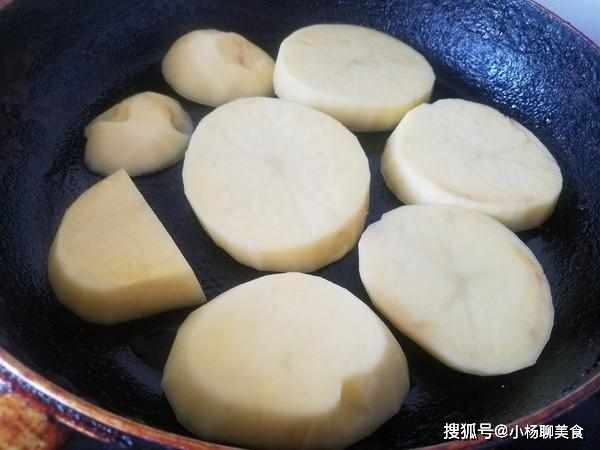 4.將土豆片擺放到鍋裏,蓋上蓋中火煎制。