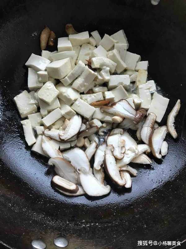 3.鍋底放油七分熱放蒜片爆香,再放豆腐加鹽稍煎一下,放一邊或盛出都可,然後放入香菇炒出香味,加入蓋過食材的水燜煮,煮開後倒入肉片煮熟後放入蔥花即可。