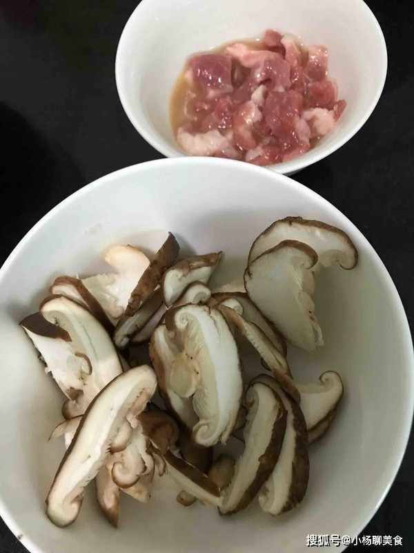 2.香菇切片,肉切片,肉可以用蚝油拌一下