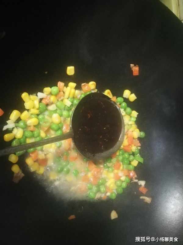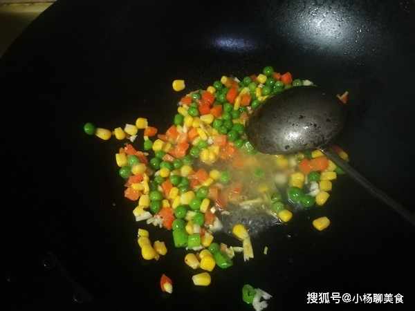 6.鍋內加入油10克燒熱至3成,加入薑葱蒜粒,抄香,加入雜蔬粒,炒熟。