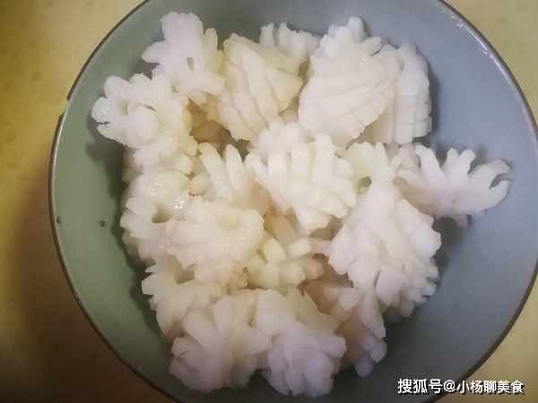 3.魷魚花(可用冰鮮魷魚,切十字花,汆水備用)解凍,洗淨備用。