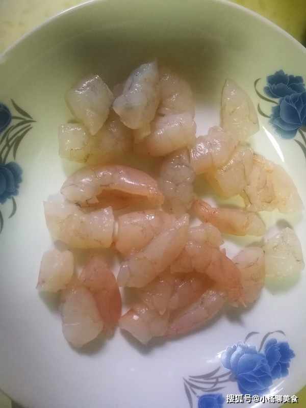 1.抽腸蝦(河蝦,海蝦均可;凍蝦,鮮蝦均可),洗淨(鮮蝦要抽腸,去殼,去頭尾),按蝦的大小改刀(我用的是15克/只的蝦,每只切兩刀),備用。