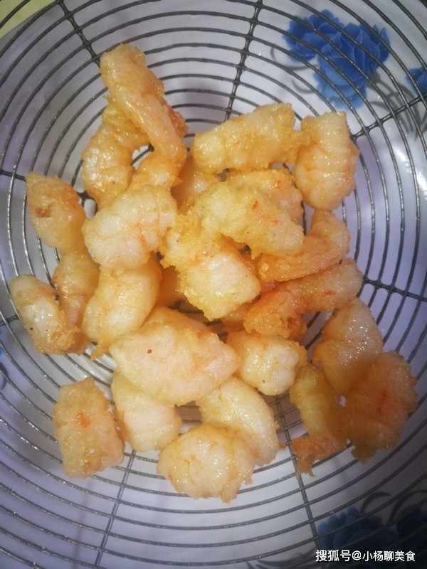 4.鍋內倒油,燒至150°(四成熱),倒入蝦仁,中火慢炸至蝦仁熟透,撈出,繼續燒油,使油溫至八成熱(200°)薑蒜切末,葱切粒備用