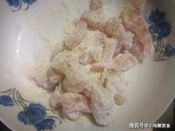 2.改刀的蝦撲上幹澱粉(將蝦仁倒入幹澱粉中,用手抓勻,讓每顆蝦仁都均勻的裹上澱粉)。