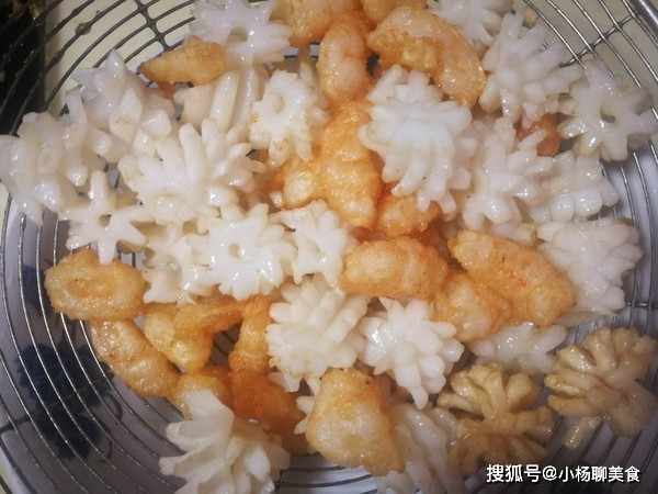 5.將魷魚花,炸好的蝦仁一併倒入鍋中炸至表面金黃,撈出,空油備用。鍋內油全部倒出。調汁:將生抽,鹽,雞精,蚝油,鮑魚汁倒入調料碗中攪拌均勻備用(可加入少許清水)。