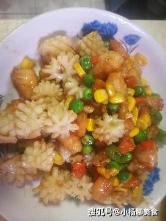 抽腸河蝦(海蝦)120克、魷魚花120克、雜蔬粒200克、料酒1匙、菜籽油適量、精鹽2克、蚝油1匙、鮑魚汁1匙、大葱一根、老薑5克、蒜5克、幹澱粉20克、生抽10克