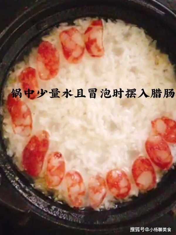 5.鍋中水量變少冒小泡時擺入臘腸