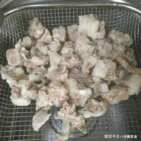2.鍋裏加入適量水,燒開後,倒入剛才洗好的排骨,大概3分左右,用水沖一下,把血水轉換成的泡子沖乾淨,瀝幹水分