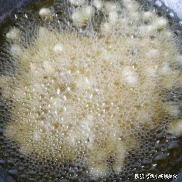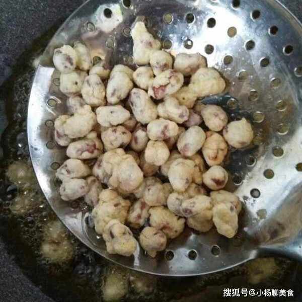 4.等油溫5成熱的時候就可以加入土豆了,火力不能太大要慢慢的炸,等聽見土豆爆開的聲音時候就可以出鍋了。