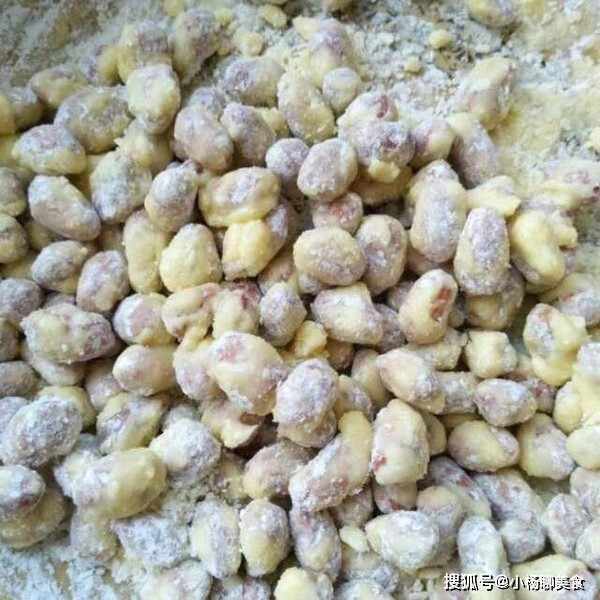 2.用筷子攪拌均勻,攪拌好了以後再往裡面慢慢的加入澱粉,一邊加一邊攪拌,保證每粒土豆都能裹上麵粉。