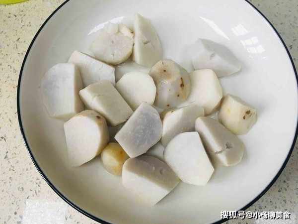 2.將芋頭洗淨去皮,切成滾刀塊倒入鍋中,加清水沒過芋頭,大火燒開然後轉小火,大概10分鐘
