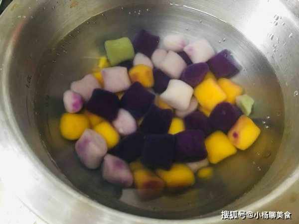 4.煮芋頭的同時準備另外一口鍋,加水燒開後放入芋圓,就像下餃子一樣直至芋圓漂浮起來後,盛出放冷水中,新增它的Q彈