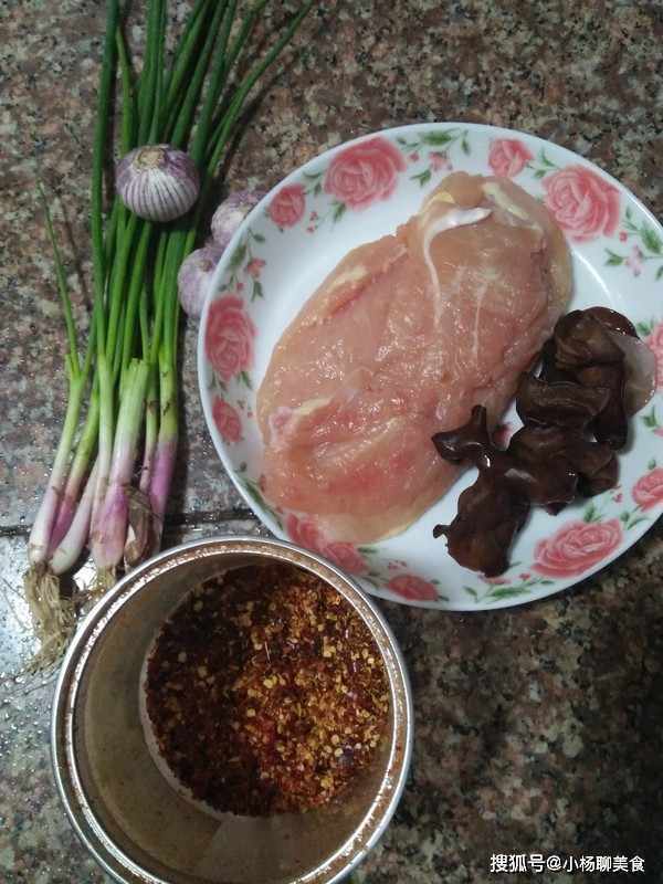 雞胸脯肉500克、耳子2克、蒜2個、葱2根、生抽2勺、辣椒2勺、香油1勺、花椒面1勺