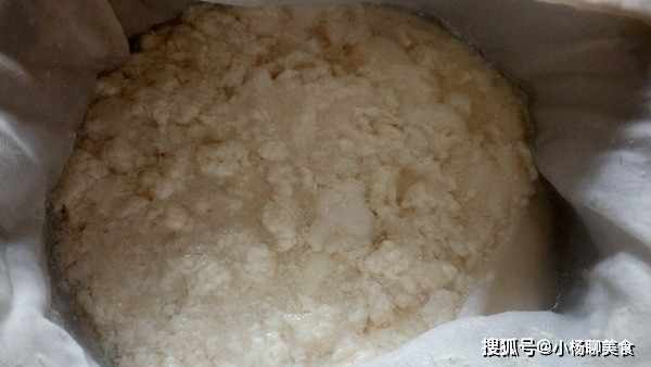 12.準備好紗袋,把豆腐和水一起倒入,包裹起來放菜籃裏,上面壓一下重物,讓水滴幹。兩個小時後拿開重物,豆腐就形成了。