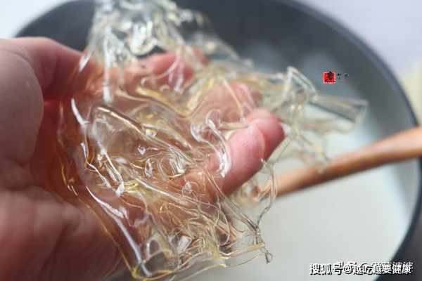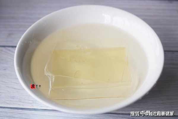 步驟1,取2片吉利丁片,放入碗中,加入冷水,浸泡3~5分鐘,直至吉利丁片完全變軟。