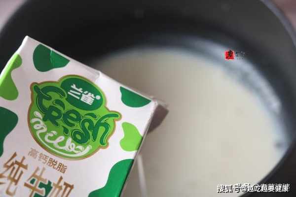 步驟2,拿出奶鍋,倒入1盒蘭雀高鈣脫脂純牛奶,開小火,煮至冒泡。