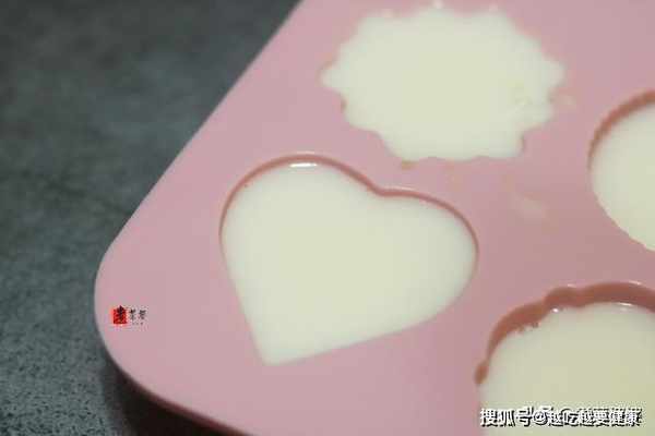 步驟6,把攪拌好的高鈣起司液,倒入矽膠模具中,靜置2小時,亦或放入冰柜中冷藏1小時,完全凝固後就可以開吃了。