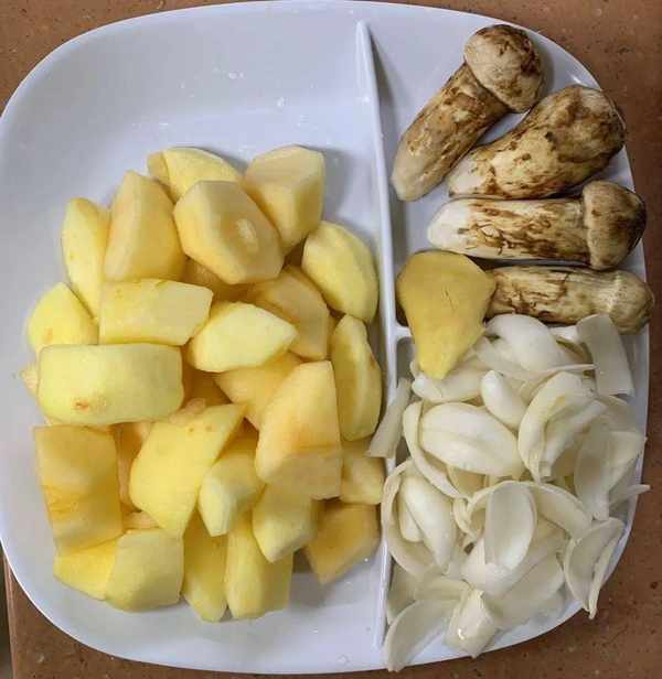 鮮松茸4 個,鮮百合2 個,蘋果2~3 個,生薑15 克,紅棗4 枚,食鹽適量。