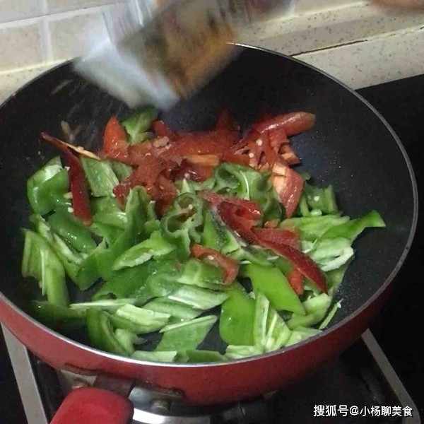 4.炒鍋加油,放入辣椒片,加食鹽、香醋、醬油、十三香調味。