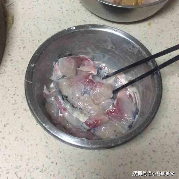 1.魚肉切片,用生粉、蛋清、食鹽、十三香醃制十分鐘。