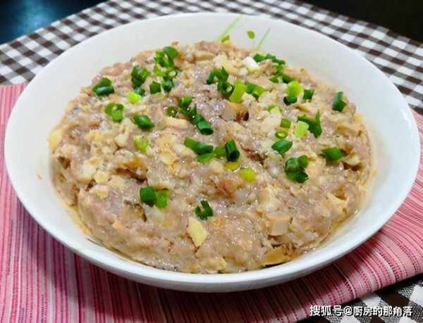 第四步:把醃制好的肉餅平鋪在盤子上面,用手按壓緊實;接著在鍋中加入適量的熱水,水燒開以後,把盤子放進鍋中,開大火蒸20分鐘左右,等到時間到了就可以出鍋了,出鍋以後在上面撒一點蔥花,色香味俱全。