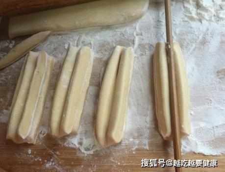 第四步,然後再壓成個人喜歡的寬度和薄厚程度,再次蓋上保鮮膜,醒20分鐘,時間差不多後,將其切成差不多2釐米左右的條狀,兩條疊放在一起,然後用筷子壓一下,即成油條生胚;