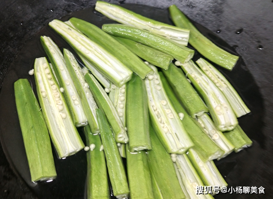 第一步:秋葵先切掉頭和尾部,然後再對半切開,因為秋葵都有黏液。切開的目地是為了更好地焯水。每次炒秋葵前我都要焯水處理,這樣可以减少秋葵上的很多黏液,吃著更清爽。