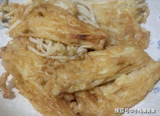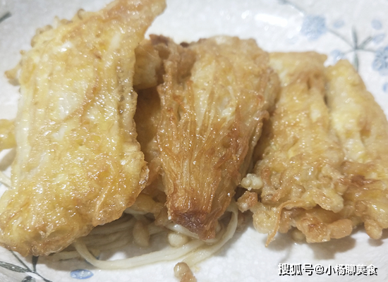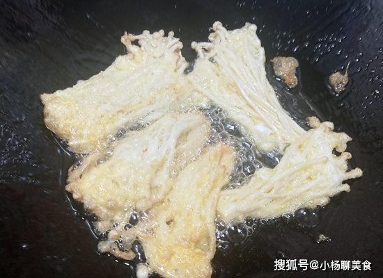 第三步:鍋裏放入油,待油溫升高後,就把金針菇放入蛋液中鹵一下再放入油鍋中,這時把金針菇放入鍋中後,金針菇像開了花似的,然後再翻一下,可以多炸幾次,開中小火,把兩面炸制金黃色,蓬鬆即可。