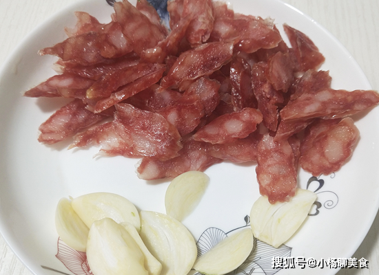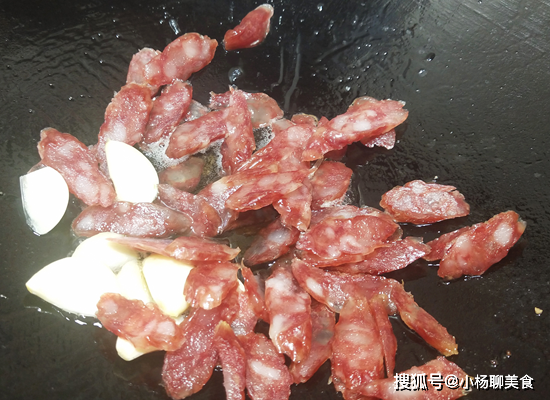 第三步:鍋裏放入油,先下入蒜片翻炒幾個來回,然後再放入臘腸片,炒制大約一分鐘左右就可以了,稍微出油即可。