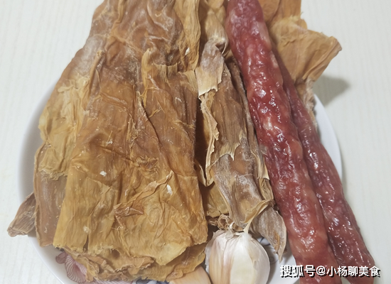 食材:幹笋衣,臘腸兩根,蒜瓣,生抽,食鹽,油