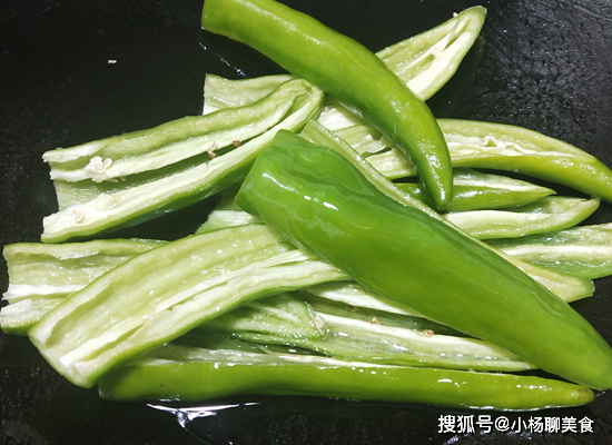 第二步:鍋裏倒入油,高油溫,把青椒爆一下,大約半分鐘後撈出,這樣做出來的辣椒脆,香,不會軟爛,口感真的很好。