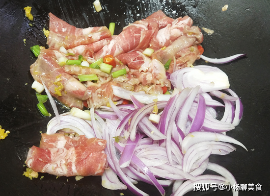第四步:鍋裏放入油,先下薑末,葱白,接著放入肥牛卷,大火煸炒,再下入紅椒,洋葱,炒制5分鐘左右。