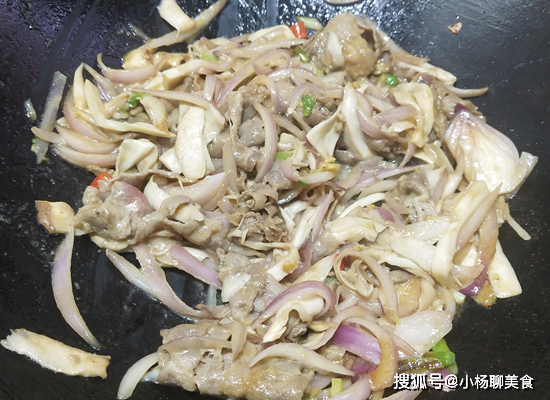第五步:再下入杏鮑菇,倒入少許啤酒,有麥芽的香氣,能去除牛肉卷的腥氣,再放入辣椒醬,蚝油,生抽,全程大火爆炒,快炒好時,撒入蔥花,就可以開吃了,是不是很簡單?
