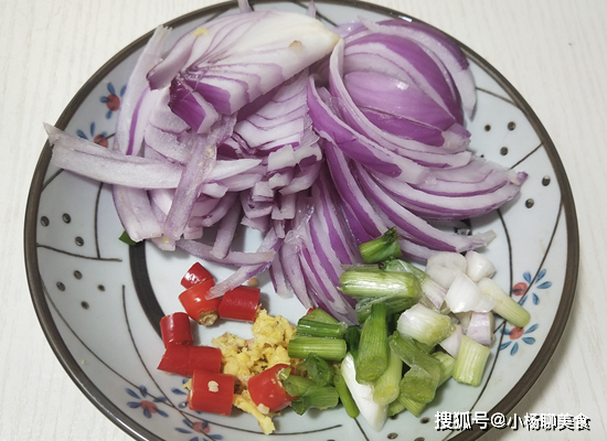第二步:紅椒切圈,洋葱,切成絲,在這菜裏起到葱香味,香味更濃郁,生薑切末待用。