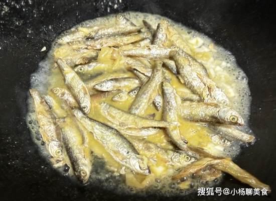 第三步:鍋內放入食用油,燒到8成熱,先把小料倒進去,泡椒,生薑,蒜末放入煸香,接著倒入河魚幹,煸炒一分鐘,再倒入少許清水,少許料酒燜煮5分鐘。河魚幹量販店買的時候已經炸好,回來只需放調味料清炒入味即可。