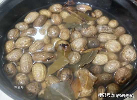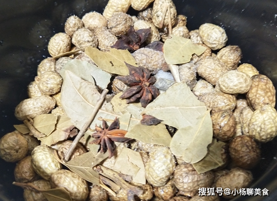 第二步:將洗淨的花生撈出後,放入鍋中,放兩個八角,少許香葉,加入鹽,清水,水的量要稍微多一些,食鹽的量也要有兩到三勺,花生更容易入味。