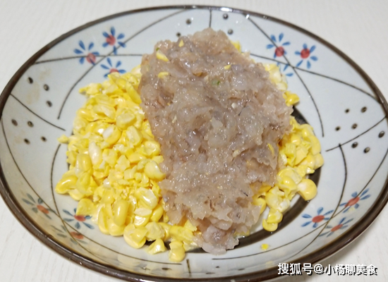 第一步:玉米要提前煮熟,然後再用勺子或者刀,先挑出一排玉米,有了突破口後,就很好剝下一粒粒的玉米粒了,然後再剁成很碎的玉米末,再和蝦膠一起拌。