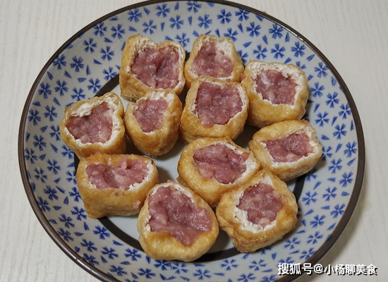 第四步:把油豆腐洗淨後,再切一小口,然後用筷子把肉末塞進油豆腐中,然後放盤中待用。