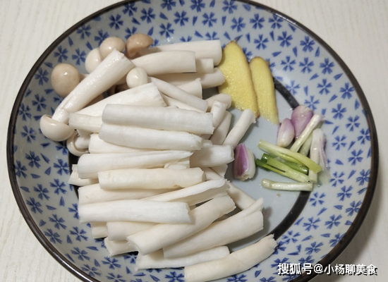 第三步:白玉菇切掉根部,再切成兩節,薑切片,葱切小段。