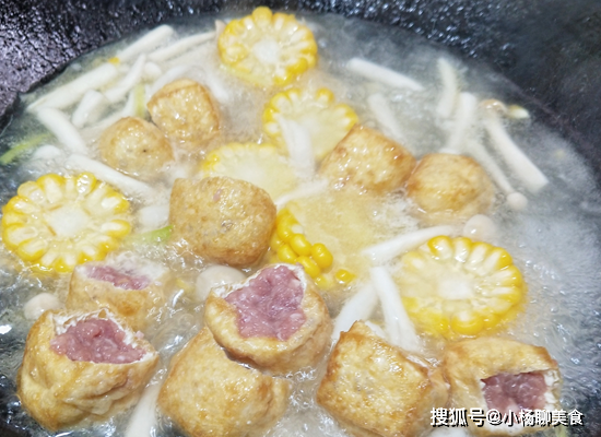 第五步:鍋裏放油,先放入白玉菇薑片煸香,再放入葱,然後加入水,下入玉米段,大火煮開五分鐘後,再放入油豆腐,然後開小火慢燉三分鐘,待油豆腐充分入味,就可以關火出鍋了。