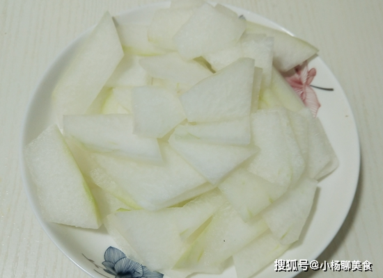 第一步:先將冬瓜清洗乾淨,然後切成薄片,接著放入盤中待用。冬瓜如果是煲大骨湯可以不去皮,做成家常湯要把皮去掉,食用起來更方便。