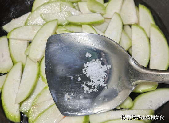 第四步:接著放入絲瓜,大火燒至沸騰後,這時調入一勺雞精,食鹽,煮制絲瓜熟透,這絲瓜就算炒好了。