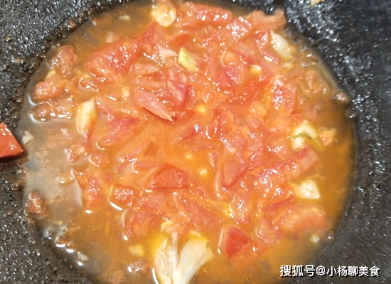 第三步:蒜末和蕃茄同時下鍋,煸炒出茄汁,這時可放入少許水,這樣蕃茄更容易出汁,為了食用方便,可把蕃茄去皮,大約炒制3分鐘。