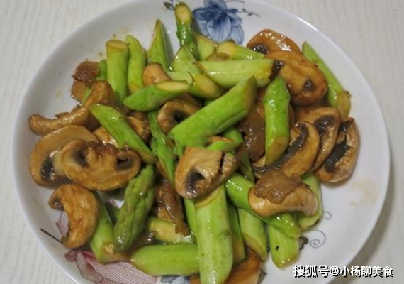 第三步:鍋裏放入油,先下入蘆筍大火翻炒兩分鐘,再放入焯好水的口蘑。