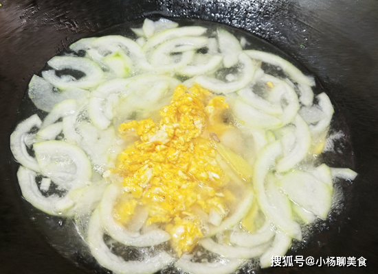 第四步:節瓜差不多煮至完全熟透後,倒入雞蛋,加入料酒,食鹽,再用鍋鏟輕輕撈一下,讓調料都攪拌均勻,即可關火。
