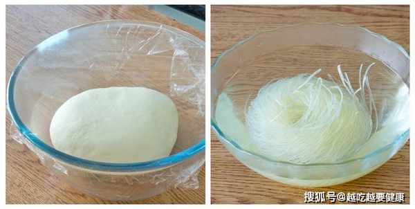 3、準備餡兒,一把粉絲加溫水泡軟;