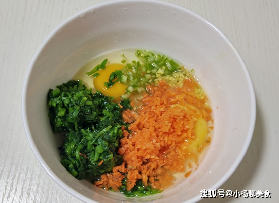 第四步:取一個碗,打入三個雞蛋,再把切好的青椒胡蘿蔔生薑末一起放入,然後攪拌均勻,這時可加入少許的鹽調味,還有10克的清水,煎出的蛋餅更嫩滑。