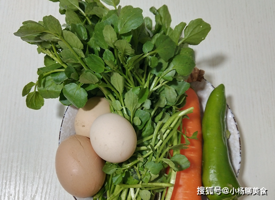食材:西洋菜一小把,青椒一個,胡蘿蔔一個,雞蛋三個,生抽少許,生薑一塊